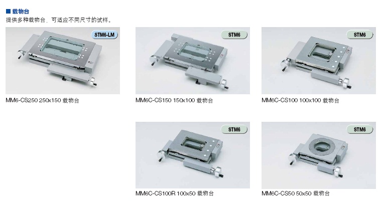 50X50mm,100X50mm,100X50MM,150x100MM多種行程載物臺(tái)可供選擇,適應(yīng)不同大小樣品的使用,更有250X150mm行程的大型載臺(tái)配套的STM7-LM型機(jī)臺(tái),共超大樣品的使用